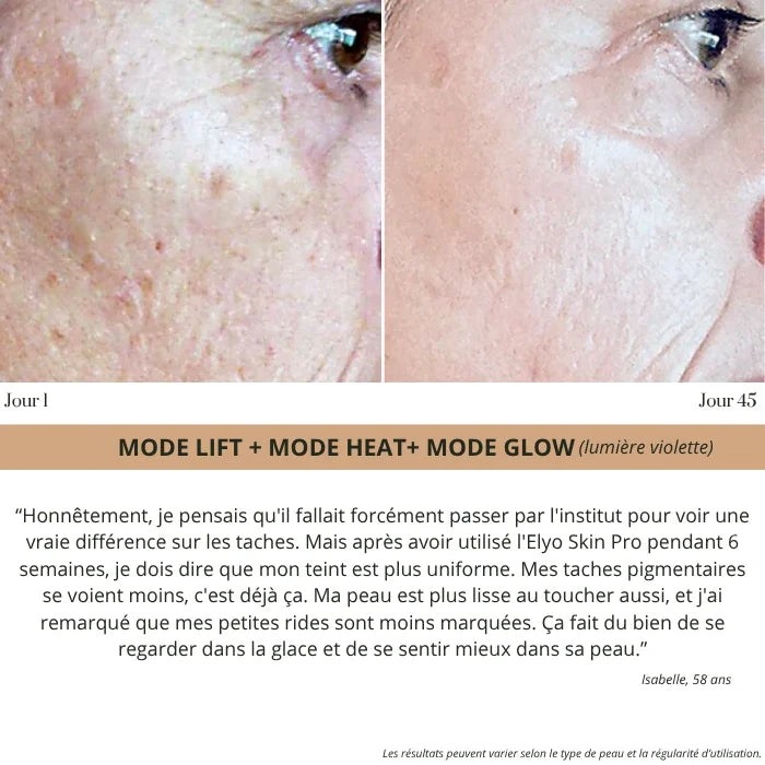 Utilisez Elyo Skin Pro trois à cinq fois par semaine, environ dix minutes par séance (visage et cou). La constance fait la différence : après 4 à 6 semaines, poursuivez au même rythme aussi longtemps que votre peau en bénéficie — c’est un rituel, pas une cure ponctuelle.
